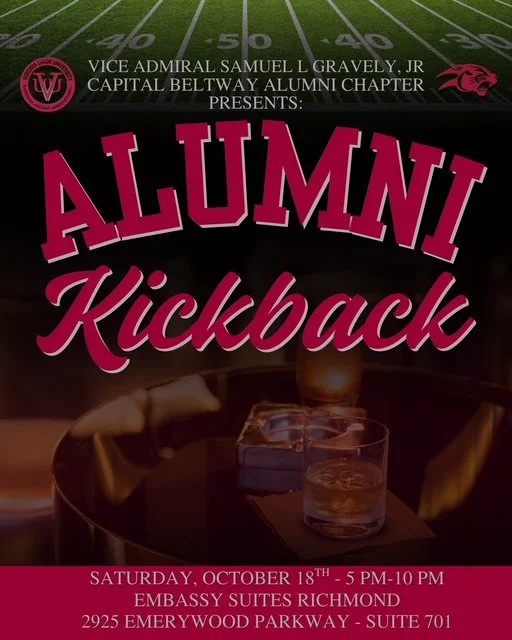 You’re invited to the Alumni Kickback hosted by the Vice-Admiral Samuel L. Gravely Capital Beltway Chapter during Homecoming Weekend. Get connected and learn about the exciting things the Vice Admiral Samuel L. Gravely Jr. Capital Beltway Alumni Chapter is doing in the region.